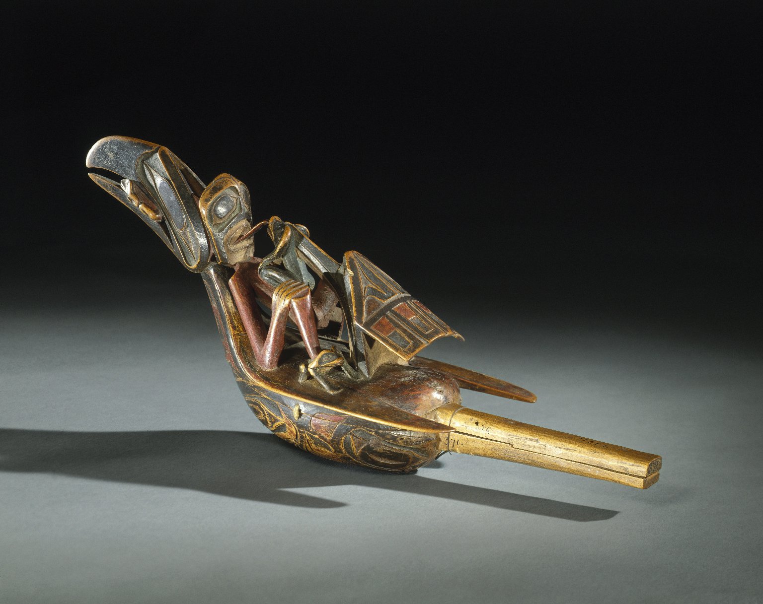 Animals indigenous to the Northwest Coast region play prominent roles in this group of objects. Rattles were part of chiefs’ ceremonial dance regalia; the Tsimshian example depicts a shaman touching tongues with a frog as he rides on the back of a raven with another frog in its mouth. The clapper by the Haida artist Charles Edenshaw takes the form of a halibut with the face of the fish’s spirit represented on the tail. The Haida frontlet, which would have been attached to a headdress, represents a raven emerging from the mouth of a whale. The Tlingit soul catcher, of a type used by shamans to capture and protect people’s souls during healing ceremonies, depicts a whale with a fin rising from the center of its back.