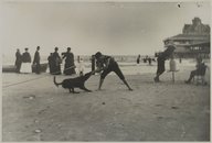 George Brainerd, a lifelong Brooklynite, produced a total of 2,500 photographs before his early death at age 42 in 1887. The majority of these were images of Brooklyn, a vast documentation of the urban landscape—dams and mills, bridges and train depots, engine houses and pumping stations—but also, especially after 1880, images of city dwellers and street scenes. This photograph, from about 1885, shows Brainerd’s attention to composition and captures the leisurely atmosphere at Coney Island, the playful tug-of-war between boy and dog contrasting with the more languid manner of the surrounding bathers.
