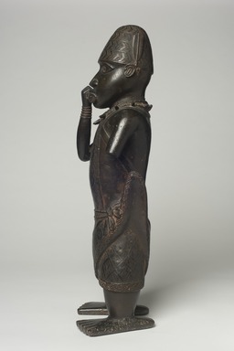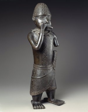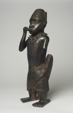Edo. Figure of a Hornblower (Ikpakohẹn), ca. 1504–50. Copper alloy, iron, 24 1/2 x 8 1/2 x 6 in. (62.2 x 21.6 x 15.2 cm). Brooklyn Museum, Gift of Mr. and Mrs. Alastair B. Martin, the Guennol Collection, 55.87. Creative Commons-BY (Photo: Brooklyn Museum, 55.87_threequarter_right_PS11.jpg)