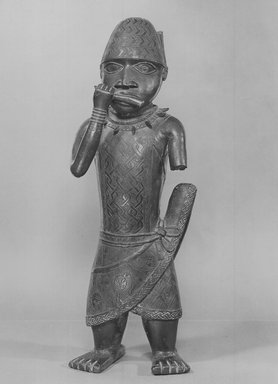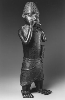 Edo. Figure of a Hornblower (Ikpakohẹn), ca. 1504–50. Copper alloy, iron, 24 1/2 x 8 1/2 x 6 in. (62.2 x 21.6 x 15.2 cm). Brooklyn Museum, Gift of Mr. and Mrs. Alastair B. Martin, the Guennol Collection, 55.87. Creative Commons-BY (Photo: Brooklyn Museum, CUR.55.87_print_threequarter1_bw.jpg)