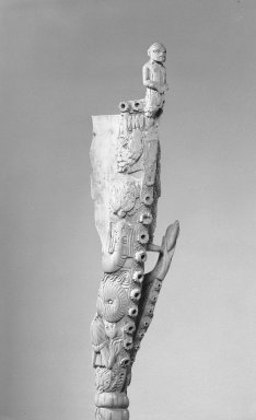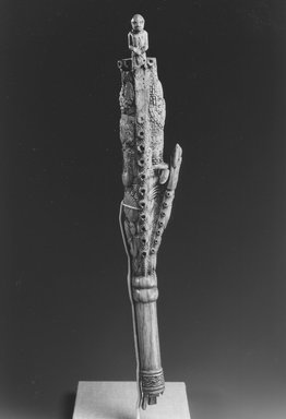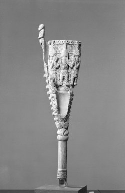 Two bell forms on a long handle; large bell carved with 3 figures: chief standing with arms upheld by attendants; background is elaborately carved with curved interlocking pattern, small bells or facsimiles of same run-up sides of sisturn and along top; one side of top has projecting human figure, on top of small bell is an alligator head holding a human hand. Base is geometrically carved. Large bell originally showed mudfish figure and snake-wing bird.