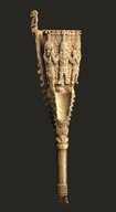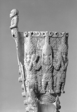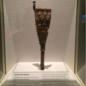 This is one of the oldest surviving African ivory sculptures; only six of these ivory gongs are known. Double gongs were used by the oba (king) during the Emobo ceremony to drive away evil spirits. The carving here depicts the oba, supported by his military commander and his heir.