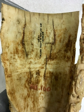 Until 1897, Benin Kingdom; 1897, taken from the Royal Palace during the British military raid and occupation of Benin City by Dr. Felix Norman Roth; 1898, collection of Henry Ling Roth of Halifax, United Kingdom; October 2, 1898, purchased from Henry Ling Roth by Augustus Henry Lane-Fox Pitt-Rivers of Dorset, United Kingdom; 1898-1958, collection of the Pitt-Rivers Museum, Dorset, United Kingdom; 1958, purchased from the Pitt-Rivers Museum by Mathais Komor, New York, NY; October 8, 1958, purchased from Mathias Komor by the Brooklyn Museum.