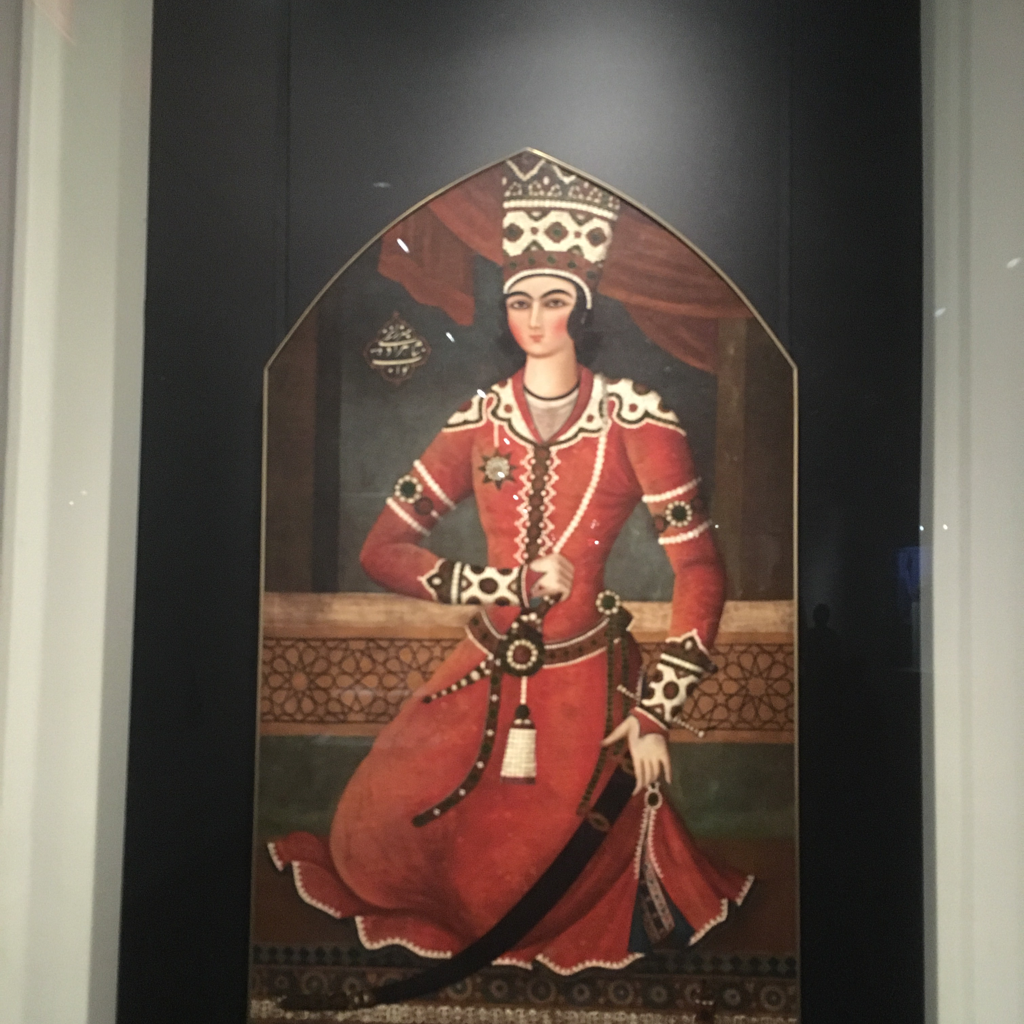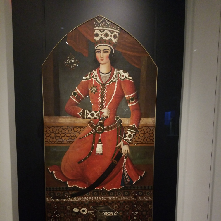 The painting depicts a Persian prince named Yahya. He was the 43rd son of Fath 'Ali Shah, the second ruler of the Qajar Dynasty in Persia. Yahya served as a regional governor--a common role for royal sons not in the line of succession--in northern Iran. Look up close and you'll see that all the gems have made to appear 3D!