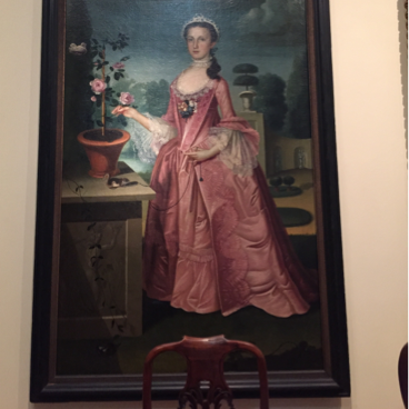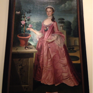 This portrait is also full of symbolism. You may have read this on the wall panel text already: "William Williams portrayed his young subject in a fictional, carefully designed landscape standing alongside a relief sculpture of Apollo and Daphne, who escaped the god’s unwelcome advances by turning into a laurel tree. This detail refers to both the sitter’s chastity and her liberal education and refined upbringing. The sitter’s rose-colored dress, known as an 'open robe,' not only attests to her au courant style but also acts as an unmistakable signifier of her family’s wealth and social status."