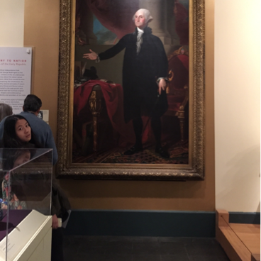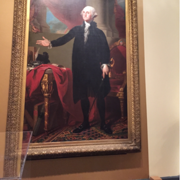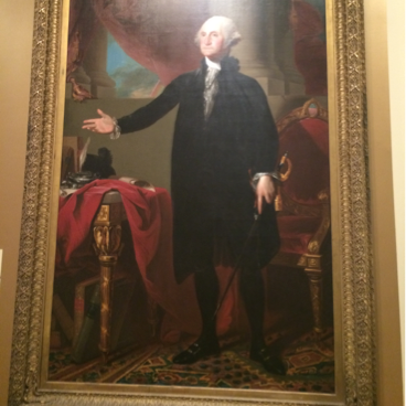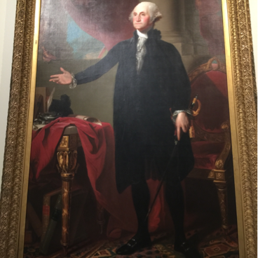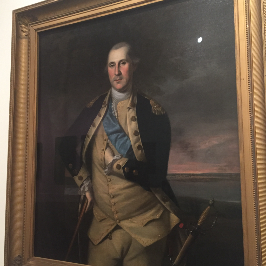 Oh! Well, this is an iconic portrait of Washington. The painting is full of symbolism, drawn from both American and ancient Roman symbols of the Roman Republic (because the U.S. was trying to build up its reputation as a new nation at the time by connecting to older empires). You can see the columns from the table cloth being pulled up. Washington's suit is plain and simple, and the sword that he holds on his left side is a dress sword and not a battle sword, symbolizing a democratic form of government, rather than a monarchy or military dictatorship. In the sky, storm clouds appear on the left while a rainbow appears on the right, signifying the American Revolutionary War giving way to the peace and prosperity of the new United States after the 1783 Treaty of Paris. The medallion at the top of the chair shows the red, white, and blue colors of the American flag.