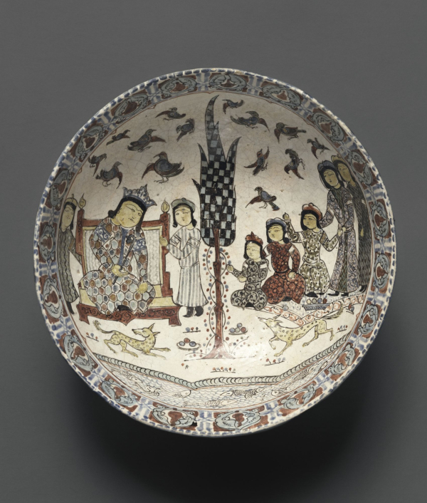 Bowl with an Enthronement Scene, Iran, Seljuk period, late 12th–early 13th century. Ceramic; fritware, underglaze and overglaze painted, gilded; 3 3/16 × 8 1/4 in. (8.1 × 21 cm). Brooklyn Museum, Gift of the Ernest Erickson Foundation, Inc., 86.227.61. (Photo: Brooklyn Museum)