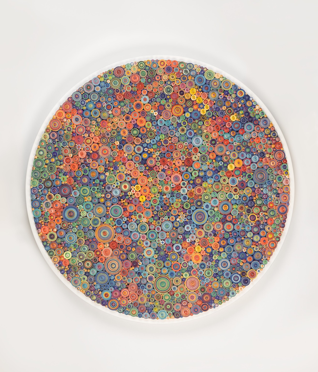 Hadieh Shafie (American, born Iran 1969). 7 Colors: Light Green, C.P. Cadmium Red Dark, Iridescent Bright Gold, C.P. Cadmium Yellow Medium, Ultramarine Blue, Phthalo Blue (Green Shade), C.P. Cadmium Orange, 2015. Ink, acrylic and paper with printed and handwritten Farsi text Eshgh (“Love/Passion”), 36 x 4 1/2 in. (91.4 cm x 11.4). Brooklyn Museum, Museum Expedition 1913-1914, Museum Collection Fund, by exchange, Bertram H. Schaffner Asian Art Fund, and Designated Purchase Fund, 2015.91. © Hadieh Shafie.