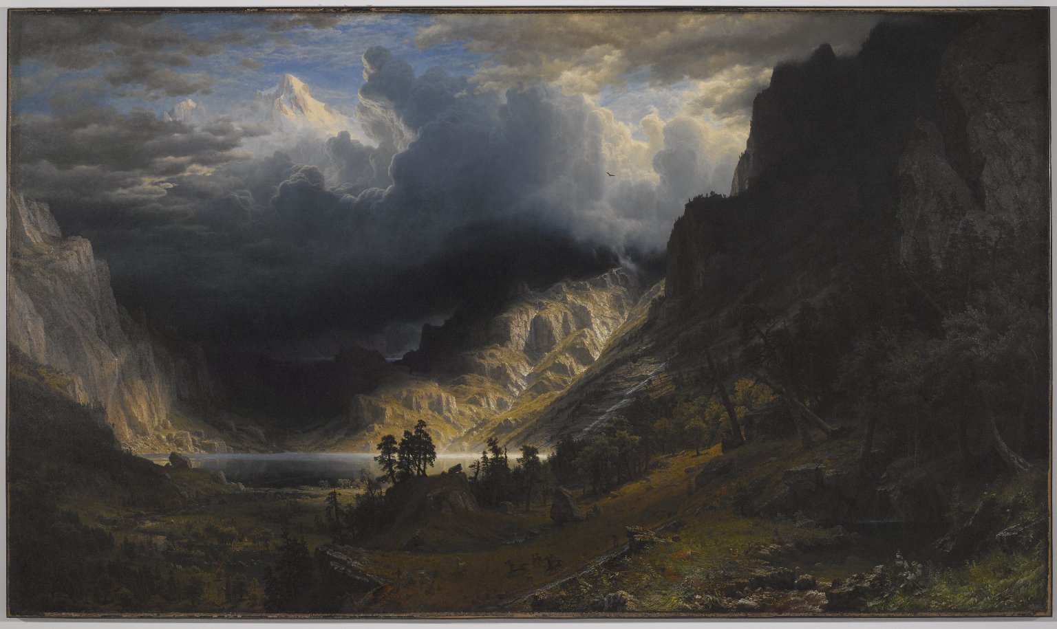 Albert Bierstadt (American, born Germany, 1830-1902). A Storm in the Rocky Mountains, Mt. Rosalie, 1866. Oil on canvas, 98 5/8 x 158 1/8 x 7 1/4 in., 286 lb. (250.5 x 401.6 x 18.4 cm, 129.73kg). Brooklyn Museum, Dick S. Ramsay Fund, Healy Purchase Fund B, Frank L. Babbott Fund, A. Augustus Healy Fund, Ella C. Woodward Memorial Fund, Carll H. de Silver Fund, Charles Stewart Smith Memorial Fund, Caroline A.L. Pratt Fund, Frederick Loeser Fund, Augustus Graham School of Design Fund, Museum Collection Fund, Special Subscription, and John B. Woodward Memorial Fund; Purchased with funds given by Daniel M. Kelly and Charles Simon; Bequest of Mrs. William T. Brewster, Gift of Mrs. W. Woodward Phelps in memory of her mother and father, Ella M. and John C. Southwick, Gift of Seymour Barnard, Bequest of Laura L. Barnes, Gift of J.A.H. Bell, and Bequest of Mark Finley, by exchange , 76.79.