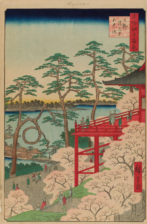 Utagawa Hiroshige. Kiyomizu Hall and Shinobazu Pond at Ueno (Ueno Kiyomizudō no ike), no. 11 from 100 Famous Views of Edo, 4th month of 1856. Woodblock print. Brooklyn Museum; Gift of Anna Ferris, 30.1478.11. (Photo: Brooklyn Museum)