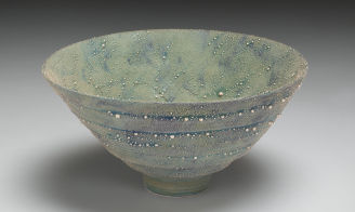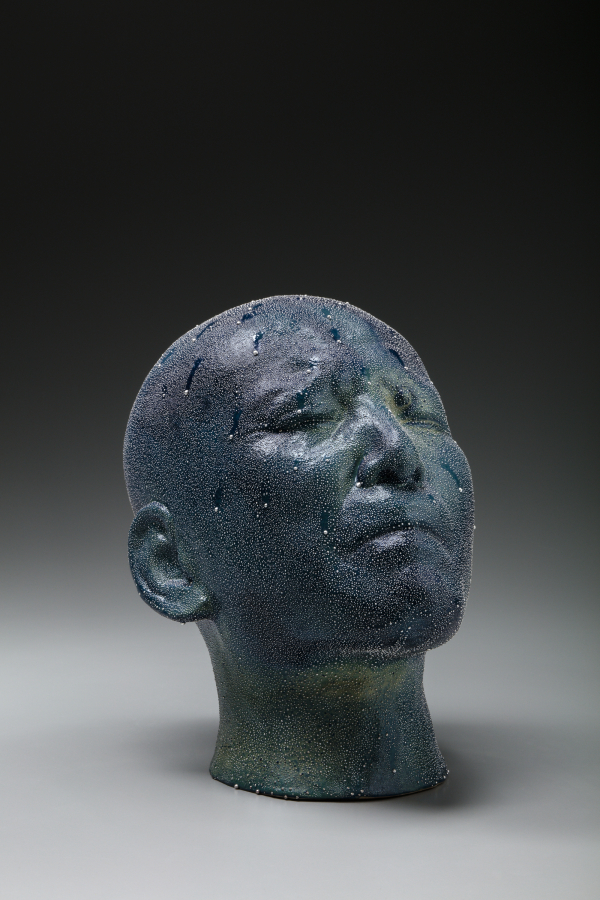 This porcelain head, a self-portrait, is glazed in shades of blue and covered with metallic droplets called “silver mist,” or gintekisai. The term, like the secret technique that produces the effect, was invented by ceramicist Kondō Takahiro (born 1958). Based in Kyoto, Japan, he carries on a legacy of innovation in ceramic art. For the last one hundred years, Kondō Takahiro and his father Kondō Hiroshi (1936–2012), grandfather Kondō Yūzō (1902–1985), and uncle Kondō Yutaka (1932–1983) have broken free of centuries-old traditions to pursue original, individual expression.