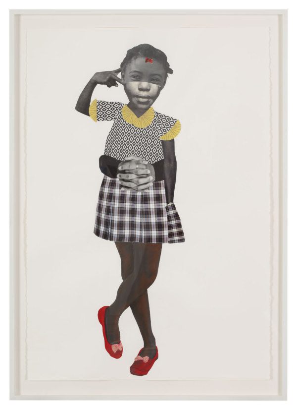 Deborah Roberts. The Visionary, 2018. Acrylic paint, ink, found photographs, gouache on paper. The Dean Collection, courtesy of Swizz Beatz and Alicia Keys. © Deborah Roberts. (Photo: Glenn Steigelman)